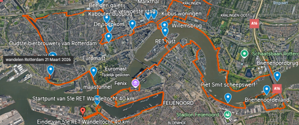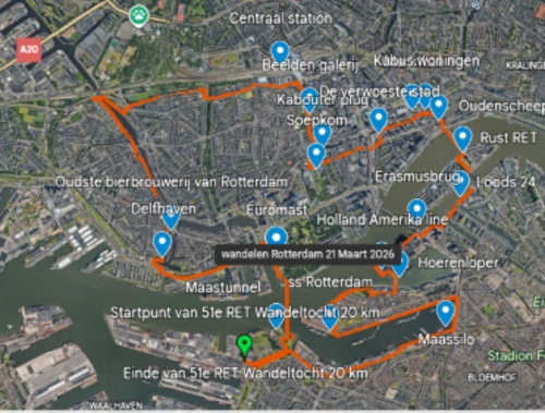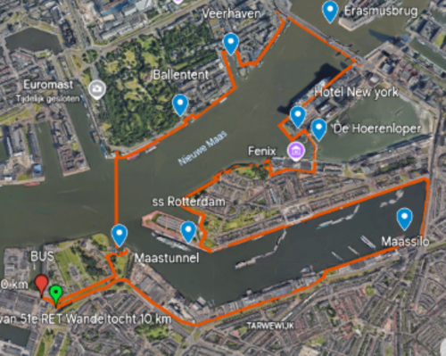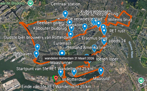 De wandelaars van de 10 km komen langs de historische ” Veerhaven ” , gelegen tussen de Willemskade en de Westerkade in het klassieke Scheepvaartkwartier. Hij ligt aan de noordzijde van de Nieuwe Maas. De ” Erasmusbrug ” werd voltooid in 1996 en officieel geopend op 4 september 1996 na een bouwperiode die in 1986 begon. In de volksmond heet deze iconische brug ” de Zwaan “. Het ” Rotterdam Centraal station “ verwerkt elke dag ruim 170.000 passagiers en het werd na de verbouwing geopend op 13 maart 2014. De ” Markthal “ is een iconisch hoefijzervormig gebouw met een overdekte markthal vol verse producten , delicatessen en wereldgerechten , gecombineerd met appartementen , winkels en restaurants , onder een spectaculair kunstplafond. Het is een bruisende culinaire hotspot in het hart van de stad. Een paar stapjes verder staan ook de ” Kubeswoningen ” bij de Blaak en nabij de Oude Haven. De ” Kubeswoningen “ zijn gebouwd in 1984 en waren gereed in 1984. Het natuurgebied van ” Brienenoordeiland “ waar alleen de 40 km wandelaars komen is een mooi stukje natuur onder de van Brienenoordbrug. Sinds juni 2000 grazen er Schotse hooglanders ter bevordering van een natuurlijke begrazing. Het wordt beheerd door het Zuid-Hollands Landschap. Omhoogkijkend zien we de enorme ” van Brienenoordbrug “ met een totale lengte van 1320 meter en wel 70 meter hoog , met wel 12 rijstroken. Geniet ook even van het wijdse uitzicht. De ” Oude Willemsbrug ” samen met de inmiddels gesloopte naastgelegen spoorbrug speelde in de 2e Wereldoorlog een cruciale rol : mariniers verdedigden de brug , wat leidde tot het bombardement op het stadscentrum van Rotterdam. Het ” Joods kindermonument “ aan de Stieltjesstraat bestaat uit een stalen boog waarop de namen staat van 686 Joodse kinderen van 0 tm 12 jaar die in 1942 en 1943 werden afgevoerd vanuit ” Loods 24 “ naar Westerbork en daarna naar Auschwitz of Sobibor. Een plaat is onbeschreven om de kinderen die niet bij naam zijn te eren. Bij het monument bevindt zich ook een stukje muur van de voormalige ” Loods 24 ” waaruit de deportatie plaatsvond. Vanaf 1901 staat het iconische gebouw op de Kop van Zuid te schitteren als het voormalige hoofdkantoor van de Holland Amerika lijn of ook wel de H.A.L. ” Hotel New York “ werd geopend in 1993. Altijd een belevenis om hier even rond te kijken en te genieten van de skyline van de stad. De ” Hoerenloper “ is de bijnaam voor de ” Rijnhavenbrug “ die Katendrecht met de Wilhelminapier verbindt ; de naam verwijst naar het vroegere rosse verleden van het beroemde Katendrecht. De ” ss Rotterdam “ is het legendarische vlaggenschip van de Holland Amerika Lijn, dit schip is 228 meter lang , 28 meter breed en 51 meter hoog en is vermaard om zijn cultuurhistorische waarde van onze mooie stad Rotterdam. De ” Maassilo “ is een voormalige graansilo en graanelevator in de Rotterdamse Maashaven uit 1911 en sinds 2004 als uitgaansgelegenheid en evenementenlokatie in gebruik is.