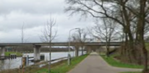 De eerste rust is te vinden aan het Maas-Waal kanaal, aan de linkerkant van de weg, vlak voor (of onder) het viaduct. Wagen D staat hier klaar voor alle wandelaars. Aan uw rechterhand ziet u het sluizencomplex. De stoelen en banken staan hier wat dicht op het parcours.